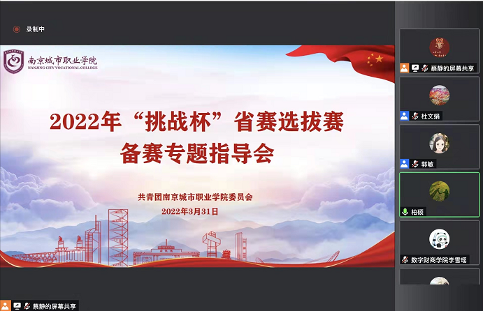 为了做好2022年“挑战杯”大学生创业计划大赛省赛备赛项目的指导工作,校团委于3月31日邀请东南大学团委兼职副书记柏硕为我校5个项目予以线上指导,郭敏老师主持会议。柏老师在东南大学校团委主要分管创业实践部工作,双创赛事经验丰富。曾斩获中国国际互联网+大学生创新创业大赛全国银奖、科创江苏创新创业大赛一等奖等双创赛事奖项10余项,现为吾驾之宝汽车技术(江苏)有限公司等4家公司联合创始人。