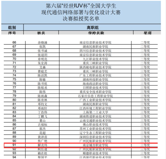 2022年9月18日至9月25日,智能工程学院2020级移动通信技术专业解贞玮、桂欣羽和2021级计算机网络技术专业武云、万梦雪同学代表我校参加了由中国通信学会主办,南京邮电大学承办的2022年第六届“经世IUV杯”全国大学生现代通讯网络部署与优化设计大赛。此项赛事共有三百余所院校的五千余名选手参赛,经过线上预赛和决赛的激烈角逐,我院解贞玮同学获得预赛一等奖,桂欣羽和武云同学获得预赛二等奖,万梦雪同学获得预赛三等奖的好成绩。综合统计获奖结果为:高职组共有155名选手获奖,我院解贞玮同学进入决赛并获得高职组决赛三等奖的较好成绩。