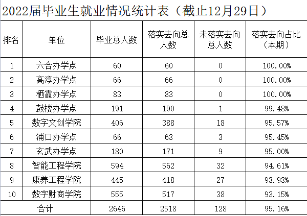 截止到12月29日,我校2022届毕业生年终毕业去向落实率为95.16%,有128人尚未落实就业。因今年就业整体形势严峻,学生慢就业,缓就业的比例更高,五年高职部分办学点“专接本”比例较高影响就业,就业工作存在一定困难。