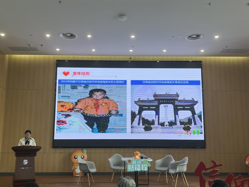 第二环节是由康养工程学院2021级健康管理2班团支部书记白溶溶同学为我们带来的微团课《用脚踏实地的奋斗丈量青春的价值》,她用亲身经历讲述了一个质朴的青年大学生在志愿服务道路上的故事。白溶溶出生于陕西省延安市,在甘肃省庆阳市度过童年,跟随父母辗转到宁夏回族自治区石嘴山市定居,从小做过留守儿童的经历让她更加了解帮扶对象的需求,在2022年的“返家乡”志愿服务中,她将自己所学都用于服务中,尽心竭力帮助每一个需要帮助的孩子。她认为,践行雷锋精神在于亲身实践,勿以善小而不为。她呼吁同学们加入志愿服务的队伍中来,与爱同行,将爱传递。