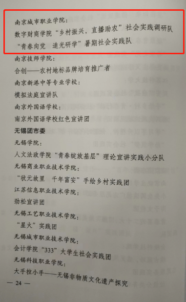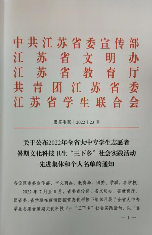 近日,我校收到中共江苏省委宣传部、江苏省文明办、江苏省教育厅、共青团江苏省委、江苏省学生联合会对组织开展的全省大中专学生志愿者暑期文化科技卫生“三下乡”社会实践活动的表彰文件,“青春向党 追光研学”暑期社会实践队和数字财商学院“乡村振兴 直播助农”社会实践调研队荣获“优秀团队”荣誉称号、康养工程学院田盈同学荣获“先进个人”荣誉称号、校团委郭敏老师荣获“先进工作者”荣誉称号。