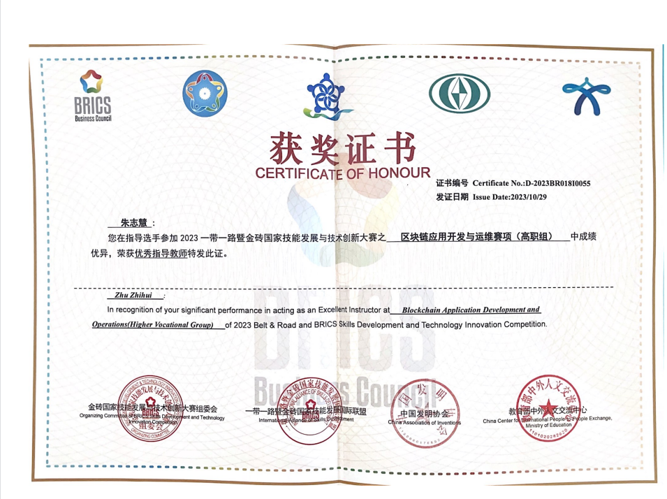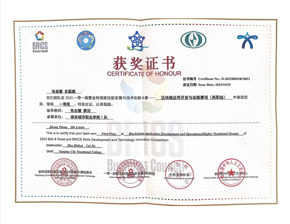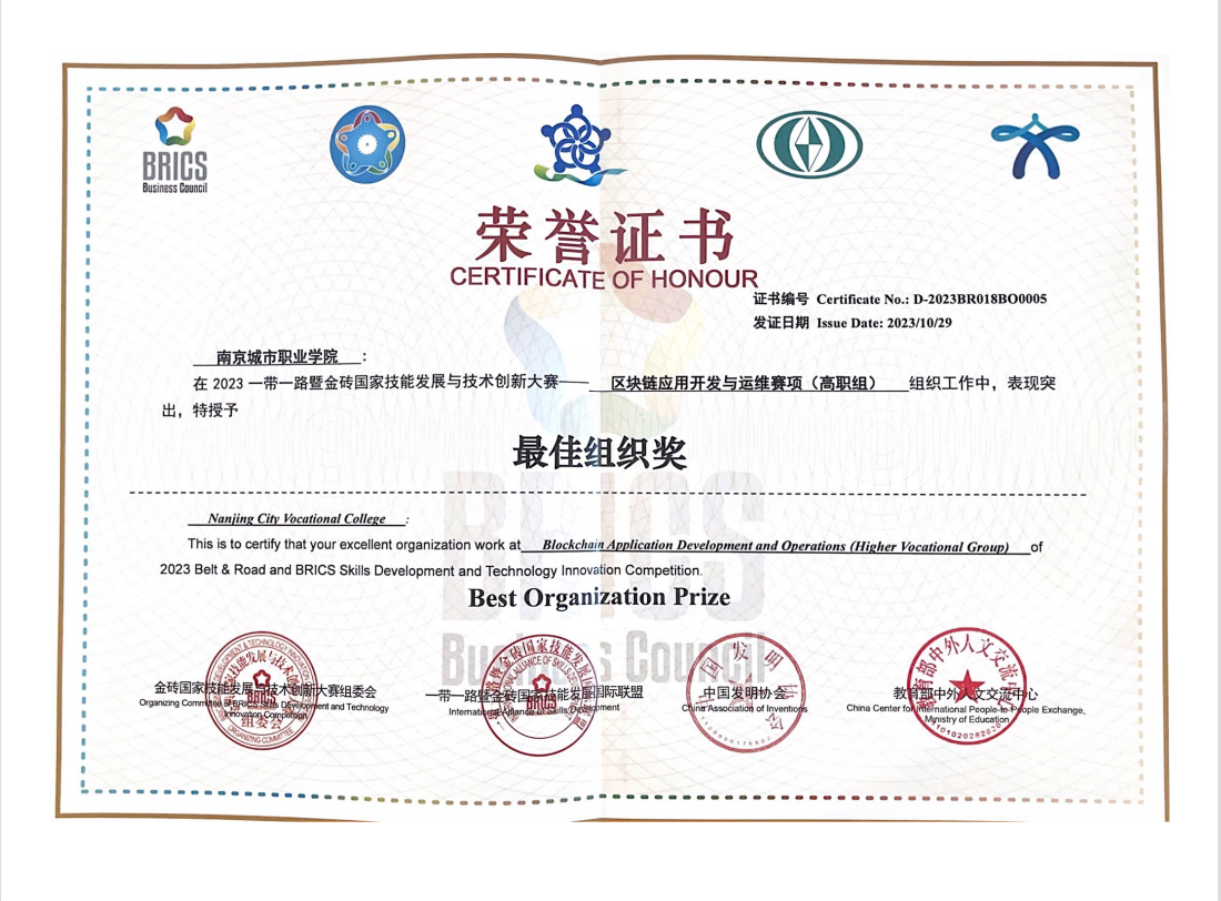 2023一带一路暨金砖国家技能发展与技术创新大赛之区块链应用开发与运维赛项于2023年10月26日-10月29日在重庆城市职业学院成功举办。来自全国11支本科参赛队、104支高职参赛队、以及来自老挝等国家的国际参赛队队员,超过230名选手展开激烈角逐,我校智能工程学院蔡洁老师、朱志慧老师指导的张益童、史磊鑫、王振隆、王超四名同学分别获该赛项全国总决赛一等奖(金牌)和二等奖(银牌)的好成绩。蔡洁、朱志慧获优秀指导教师称号,同时我校获得“最佳组织奖”。