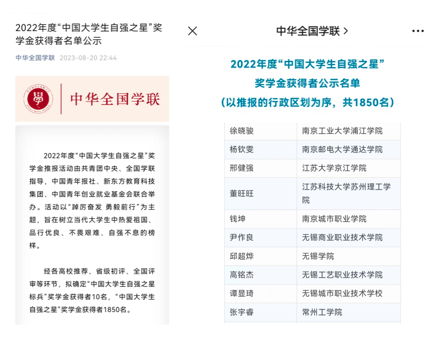 2022年度“中国大学生自强之星”奖学金推报活动,全国范围内共表彰“中国大学生自强之星标兵”奖学金获得者10名,“中国大学生自强之星”奖学金获得者1850名。此次,我校钱坤同学喜获“中国大学生自强之星”殊荣。