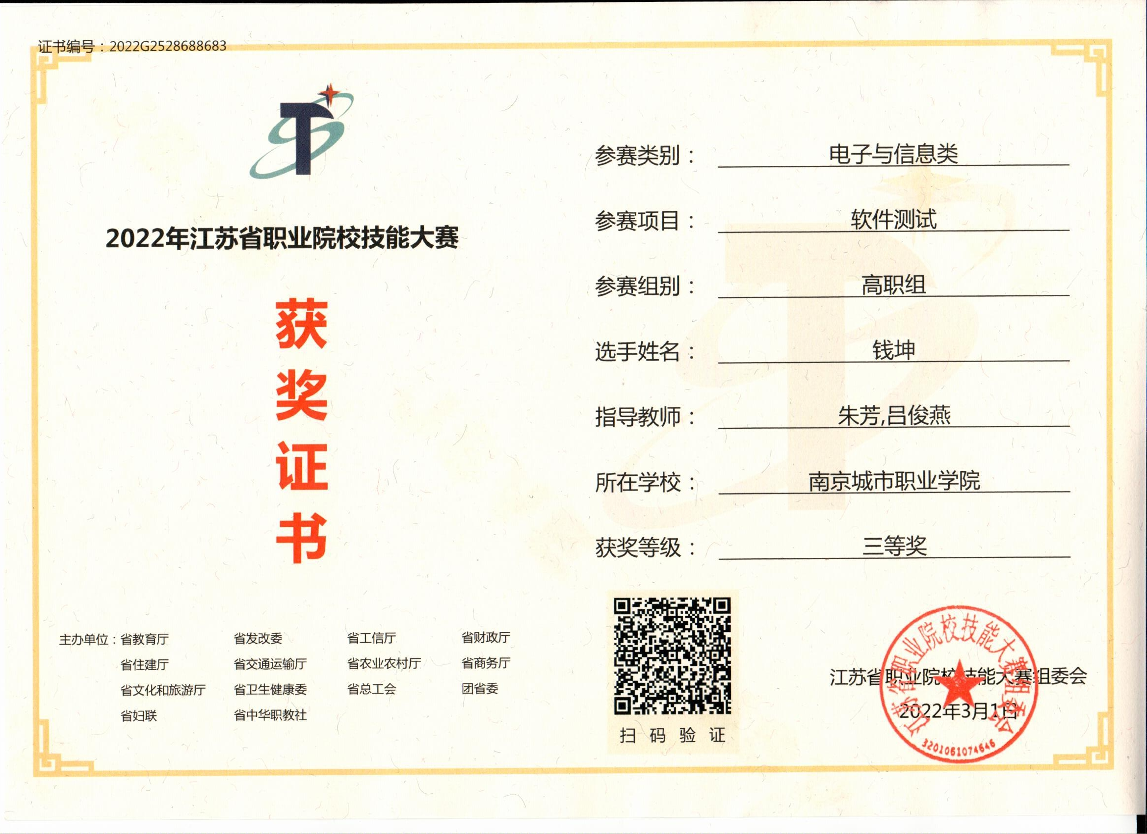 钱坤,男,汉族,中共预备党员,2020级软件技术专业学生,评定年度综合测评成绩专业排名第一,各科平均成绩达93分以上,曾任校人工智能社团副社长、2020级软件技术2班班长。所在团支部曾获校活力团支部、校文明班级、南京市五四红旗团支部等奖项和荣誉。个人曾荣获国家奖学金、国家励志奖学金、江苏省“最美职校生”、南京市“最美职校生”、校“三好学生标兵”、校“优秀学生干部”、校“优秀服务个人”、校“军训优秀学员”、校“优秀学生社团骨干”、校“创新创业标兵”、校“技术技能标兵”、全国软件嵌入式测试国赛二等奖、全国软件开发者测试国赛二等奖、全国软件移动应用测试国赛二等奖、全国软件嵌入式测试省赛一等奖、全国软件开发者测试省赛一等奖、全国软件移动应用测试省赛二等奖、蓝桥杯省赛二等奖、省技能软件测试赛项三等奖、学校综合奖学金一等奖、校社会服务奖学金、校技术技能奖学金、校创新创业奖学金等奖项和荣誉。
