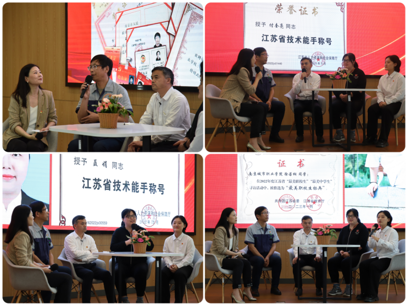 在劳模面对面环节江苏省劳模南京飞燕活塞环股份有限公司公共设施处的王林,南京市劳模、康养工程学院老师付奎亮,江苏省技术能手、数字财商学院老师聂娟和江苏省最美职校生标兵、康养工程学院学生徐若桐与在场师生对话青春,探讨人生理想,感悟劳模精神、劳动精神、工匠精神。劳模工匠们用他们的亲身经历为师生们解答青春迷惑,指引人生方向,其坚定信仰以及奋斗精神深深打动了广大师生。