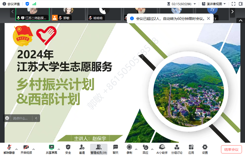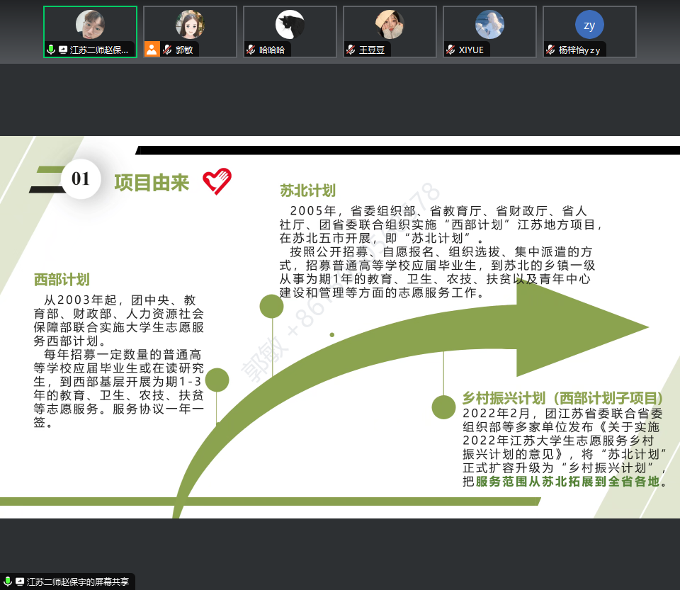 随后,赵老师重点讲解了江苏大学生志愿服务乡村振兴计划的具体内容和政策支持。他强调,乡村振兴是当前国家发展的重要战略之一,而大学生作为新时代的青年力量,应当积极参与到乡村振兴的伟大实践中来。江苏大学生志愿服务乡村振兴计划为广大学子提供了广阔的舞台和丰富的机会,通过志愿服务的方式,助力农村地区的经济发展、文化繁荣和社会进步。