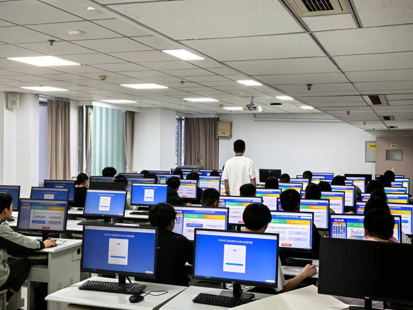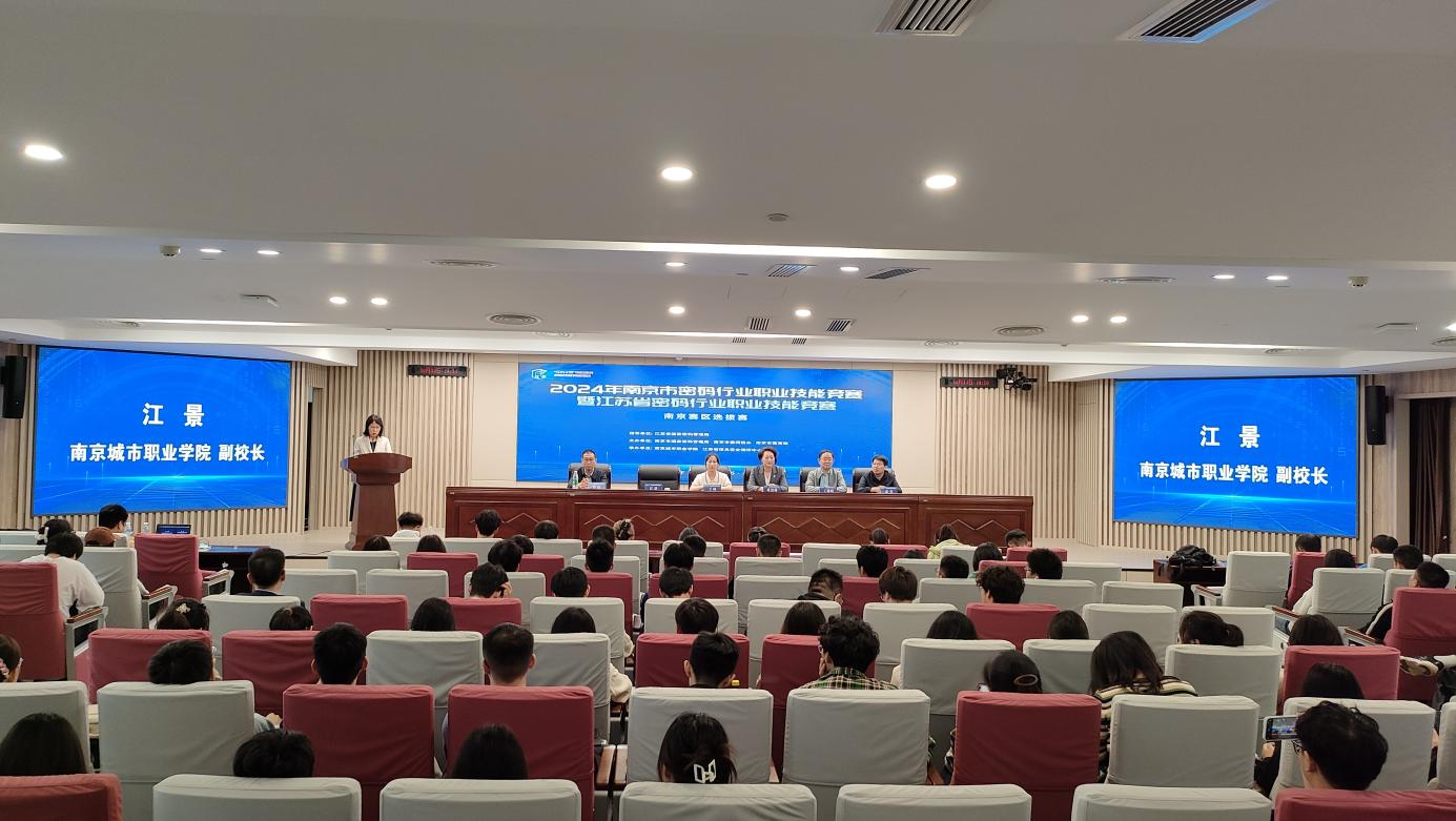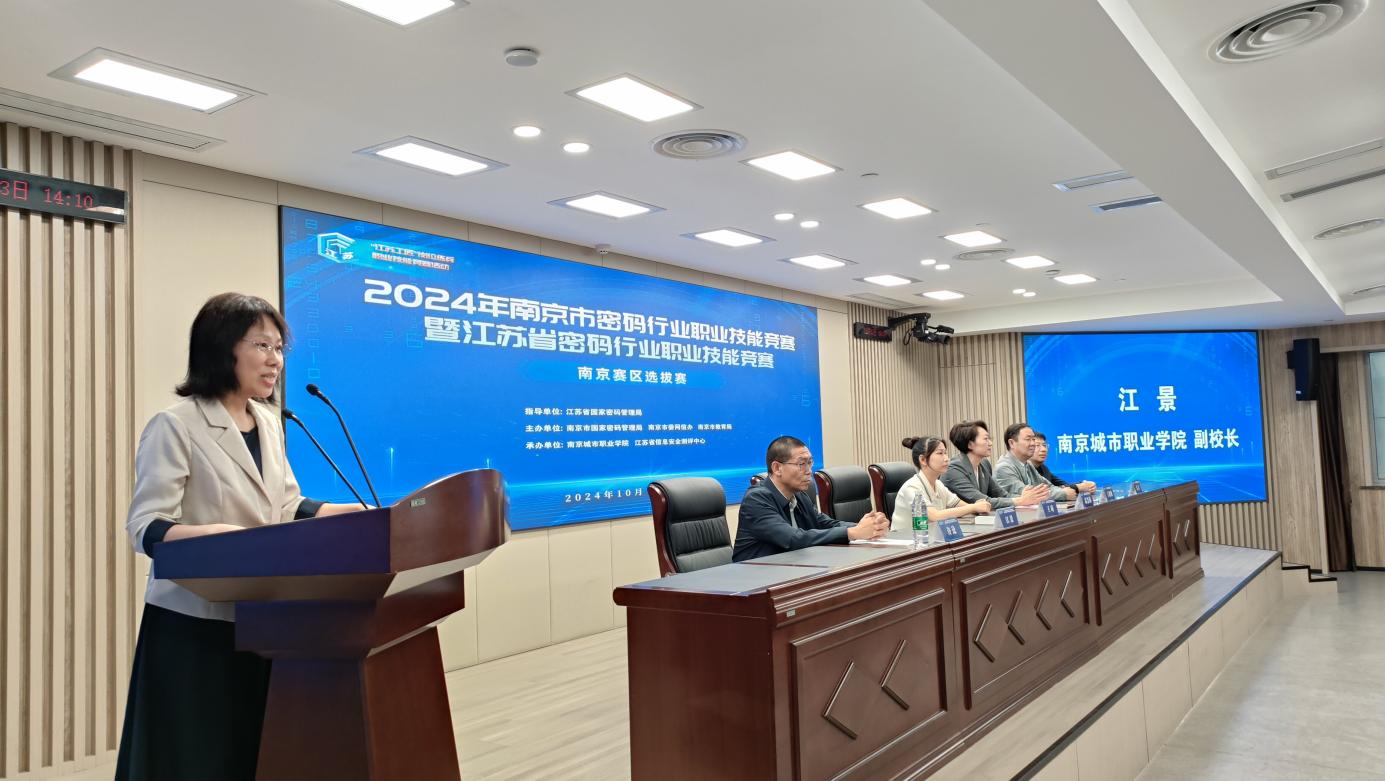 10月15日,2024年南京市密码行业职业技能竞赛暨江苏省密码行业职业技能竞赛南京赛区选拔赛在我校新街口校区举办。江苏省国家密码管理局商用密码管理处处长王琦,南京市国家密码管理局副局长葛慧莉、密码管理处处长夏青,南京市委网信办网络安全处处长丁进明,南京市教育局电教馆副馆长许奎,校党委委员、副校长江景,出席竞赛启动仪式并现场巡查督赛。