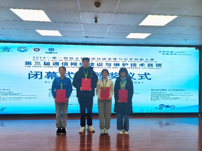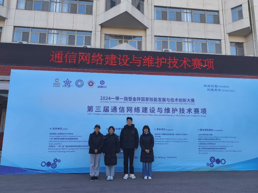 2024年12月7日—12月8日,2024年“一带一路”暨金砖国家技能发展与技术创新大赛第三届通信网络建设与维护技术赛项(高职组)国内总决赛在山东信息职业技术学院举办,经过激烈角逐,我校智能工程学院代表队在97支决赛队伍中脱颖而出,23级计算机网络技术2班学生张涛、蒋玉洁荣获二等奖,指导教师杨洋、沈娟娟荣获优秀指导老师奖,学校荣获优秀组织奖。