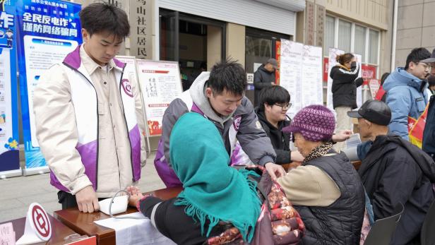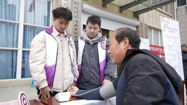 在血压检测和健康养生咨询区域,志愿者们为社区居民提供免费的血压检测服务,并根据检测结果给予健康指导和建议。“爷爷,高压有点高哦!您平时要注意饮食,清淡一点。”智慧健康养老服务与管理专业的学生朱令基对前来测压的老人说。